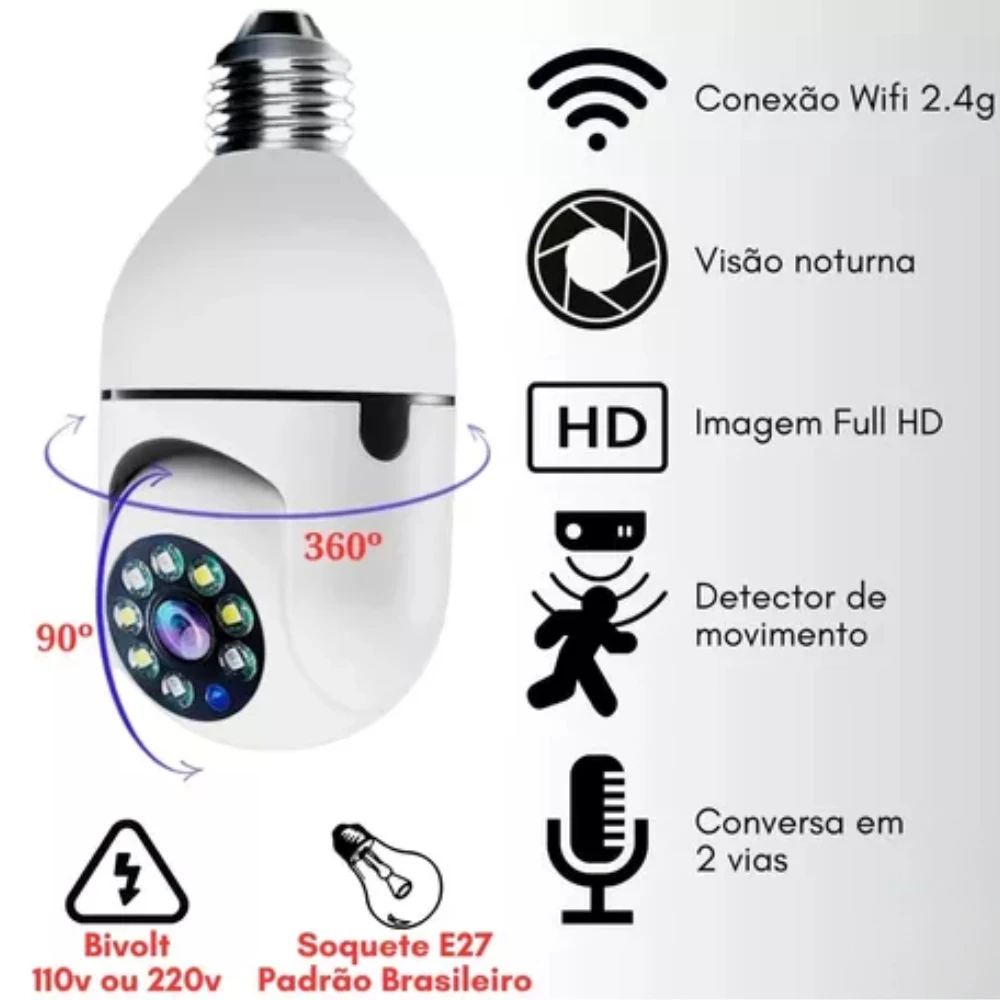 - Visão 360º com Controle PTZ: Diferente das câmeras comuns, a Câmera Lâmpada Robô permite que você gire a imagem em 355° na horizontal e 100° na vertical diretamente pelo celular, cobrindo uma área muito maior.